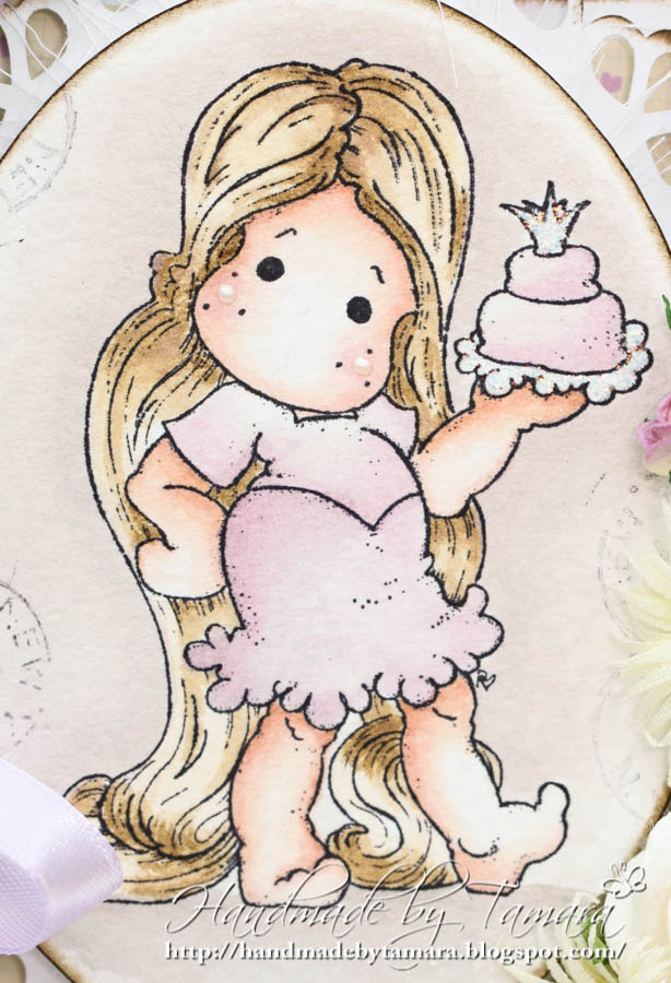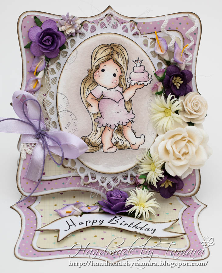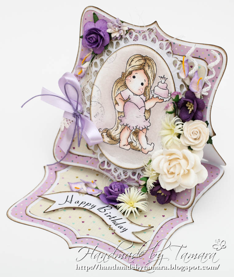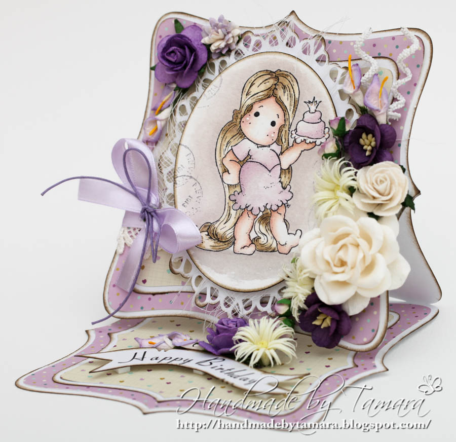 So, here we go. My first Easel card with my lovely Tangled Tilda from the new Once Upon a Time Collection. Don’t you just love them (all). 😉
