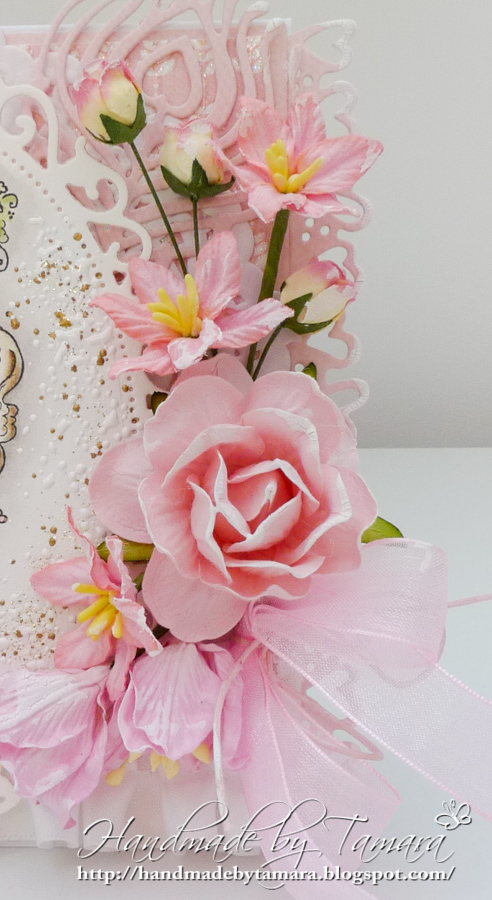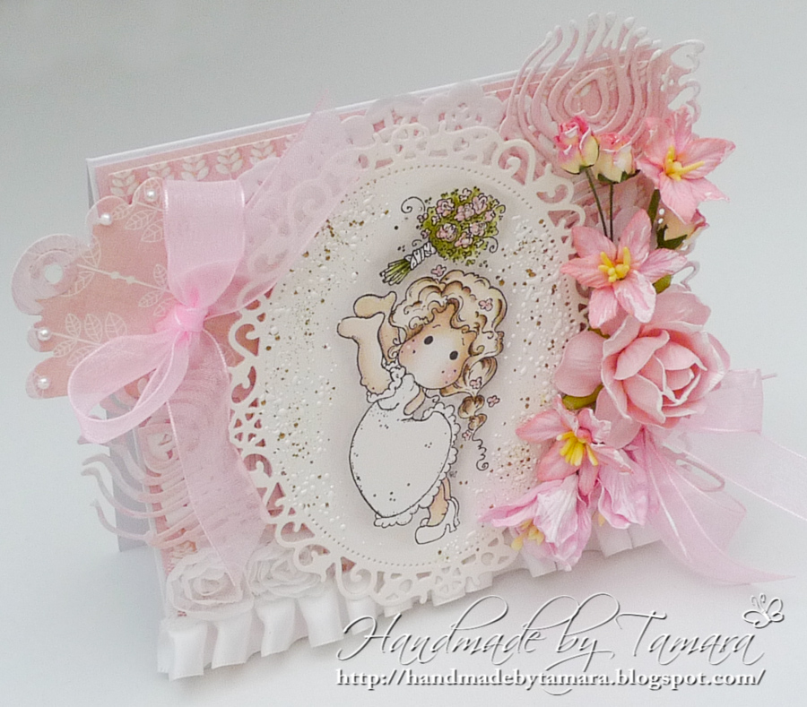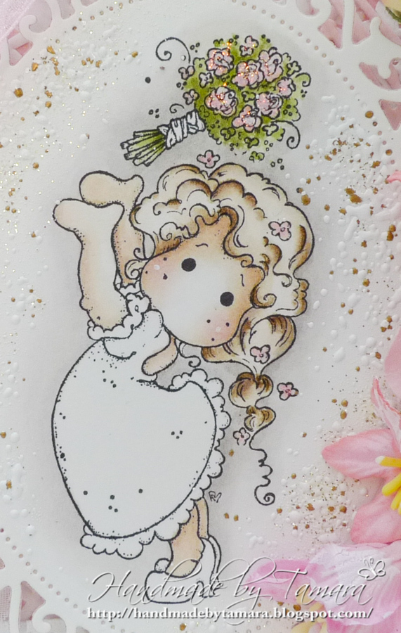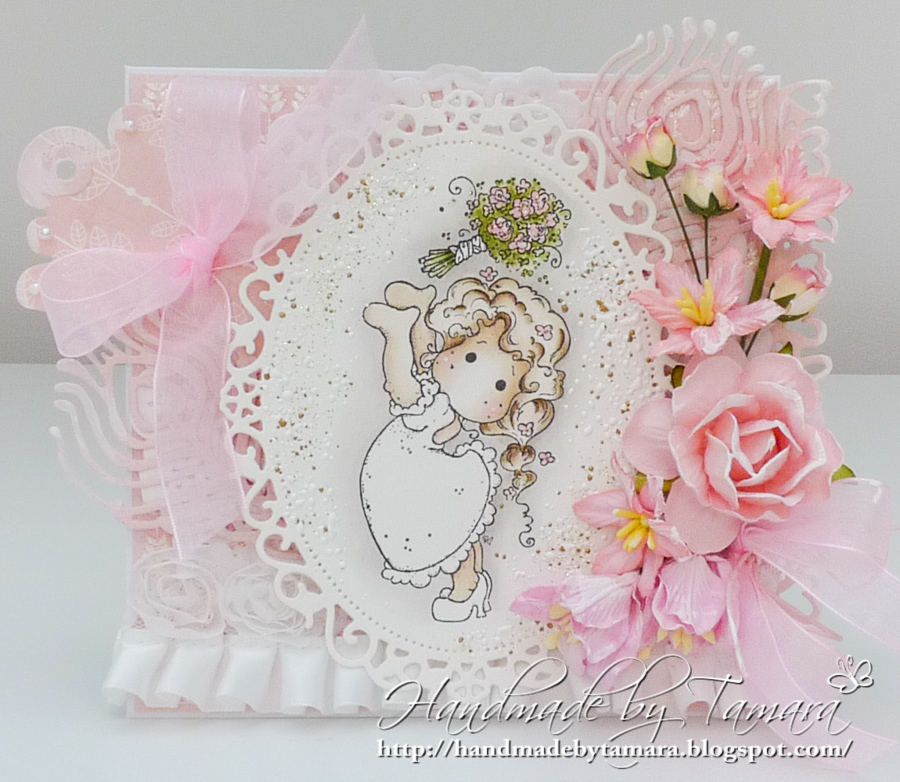 Gorgeous card, Tamara. this is the first time I've seen this Tilda image all coloured up. She's adorable. Beautifully coloured. Love all the flowers–afterall what've a wedding without flowers…LOL. Terrific diecuts.