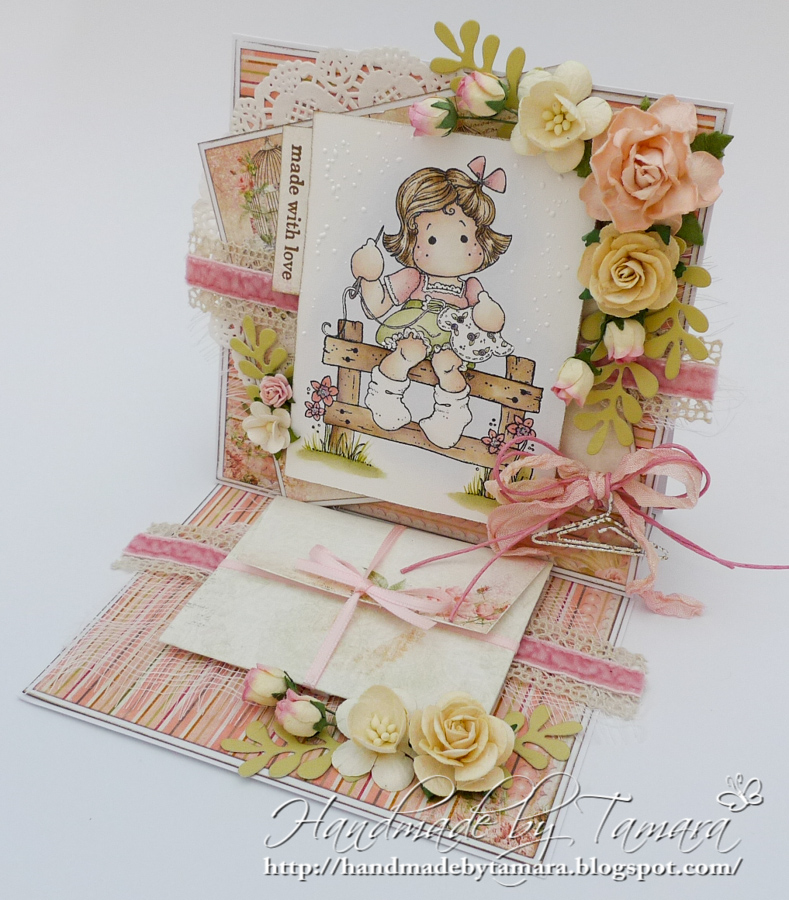 It’s been a sad week for my family. My grandmother died. I haven’t been crafting due to the lack of mojo and energy. I made this easel card last week. This was a special order for a lady who likes to sew and the main focus is on the little envelope which contains a ticket for a sewing class. 🙂