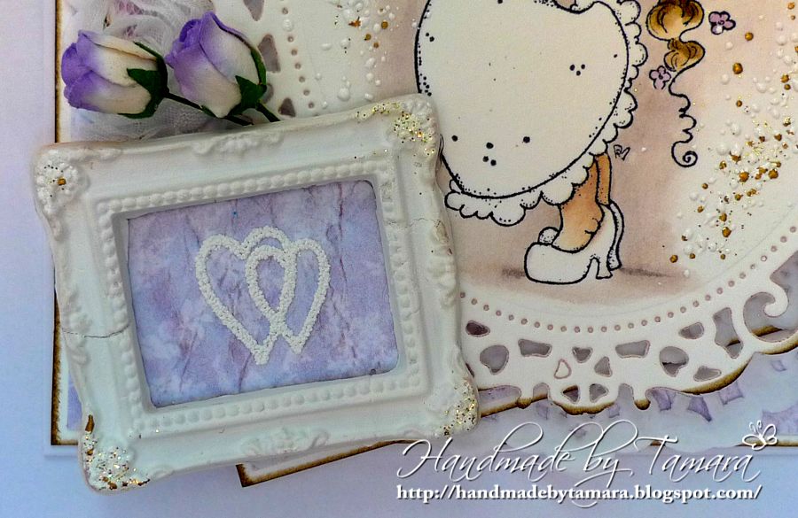 This one was made on a special request and I had a lot of fun doing it. I even used my almost forgotten white embossing powder for the hearts in the frame. 🙂 There was a lot of dust on that box. lol