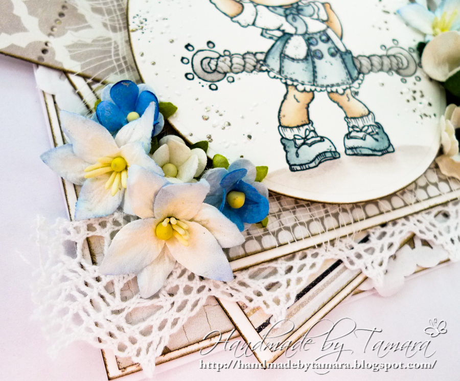 A few days back I made a Birthday card for a friend of mine. She’s a nurse, so I could use a nurse Tilda, but I wanted to try another cutie from Sea Breeze Collection, Salute Tilda. I didn’t know what to use for a background, because I don’t have many of them, so I used this rope I found among my stamps. I think they look great together. 😉