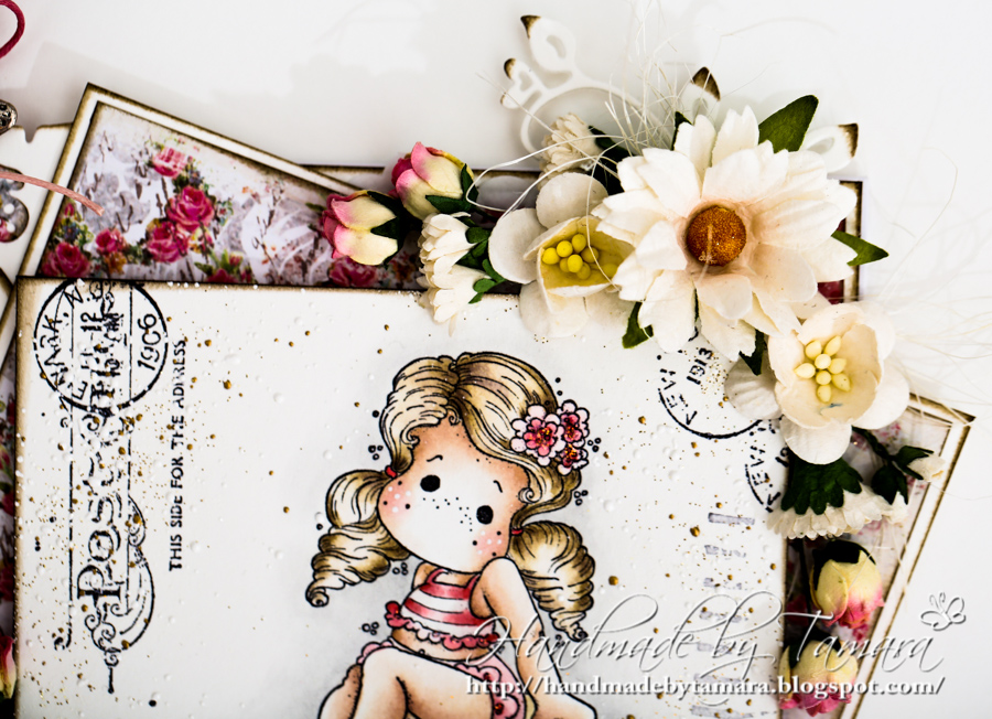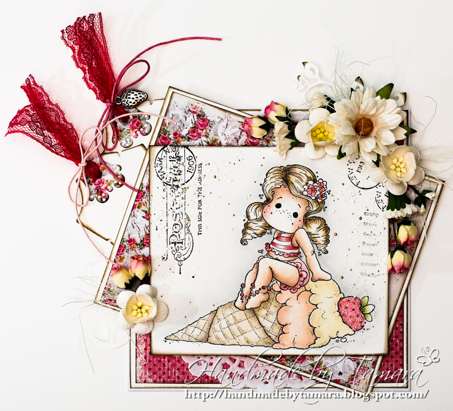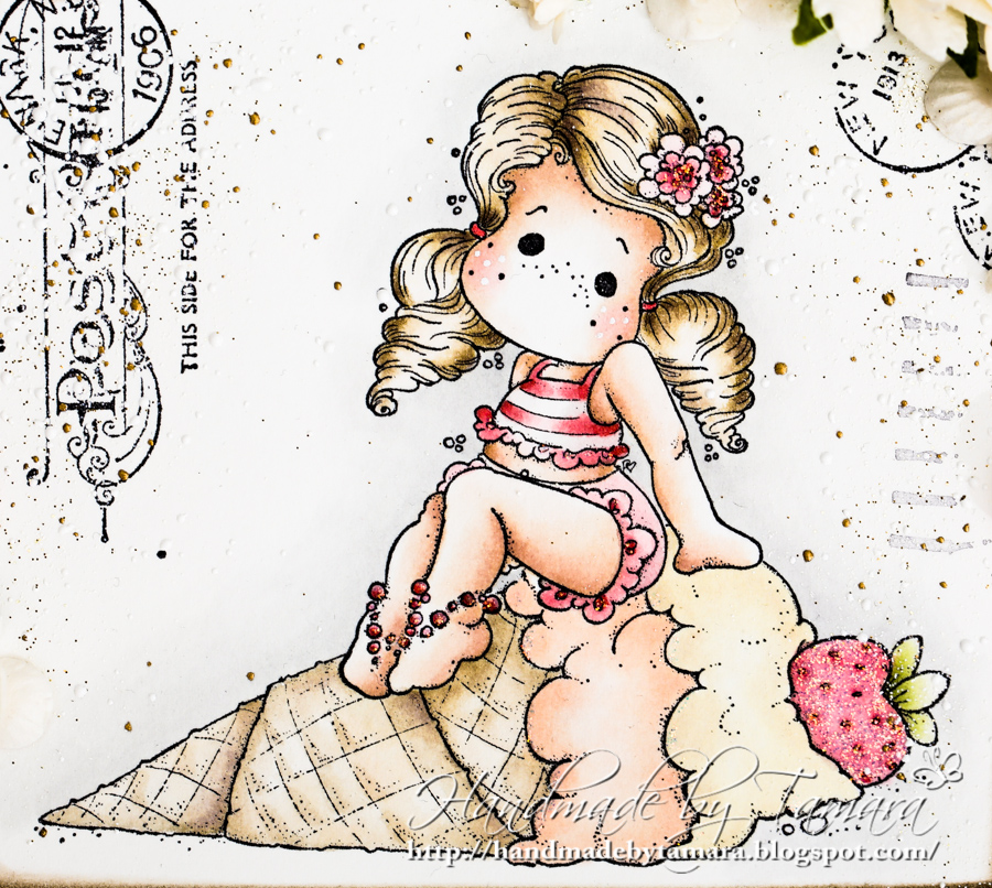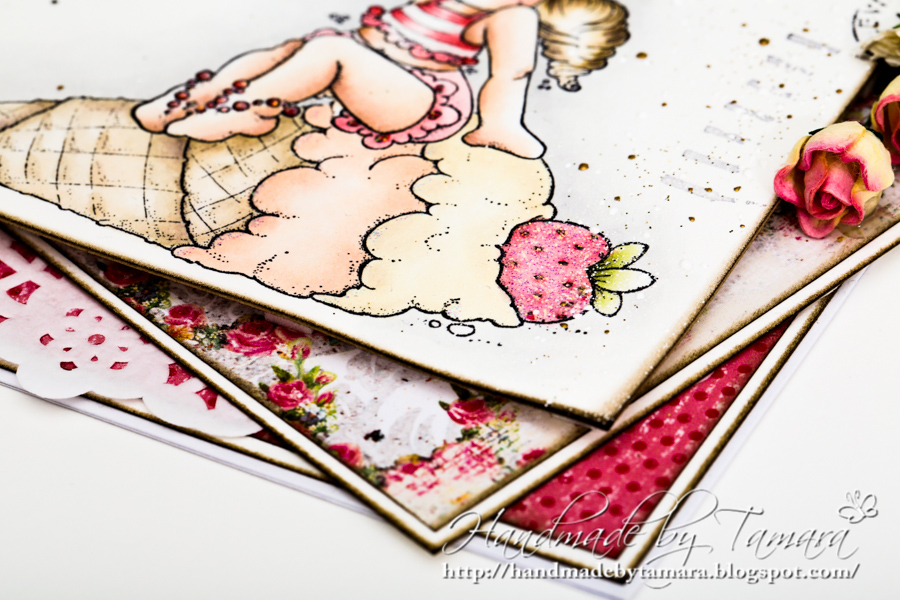 I masked two magnolia stamps, Bikini Tilda from Sea Breeze Collection and Stawberry Ice cream from Lazy summer days collection.