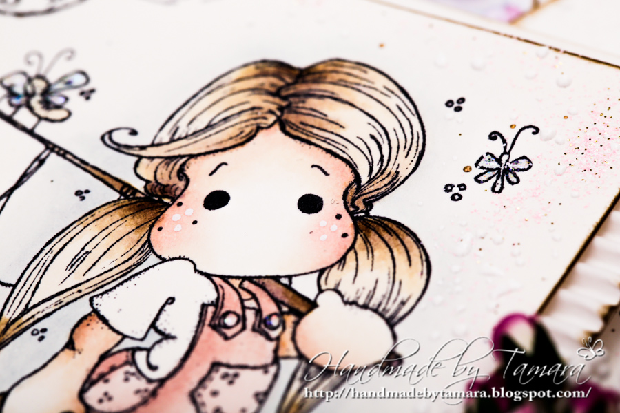 This morning I made a card using one of the new Tildas from Sea Breeze Collection called Gone Fishing Tilda. I really like her hair and the fact that she is barefoot, because I really don’t like coloring shoes. 🙂