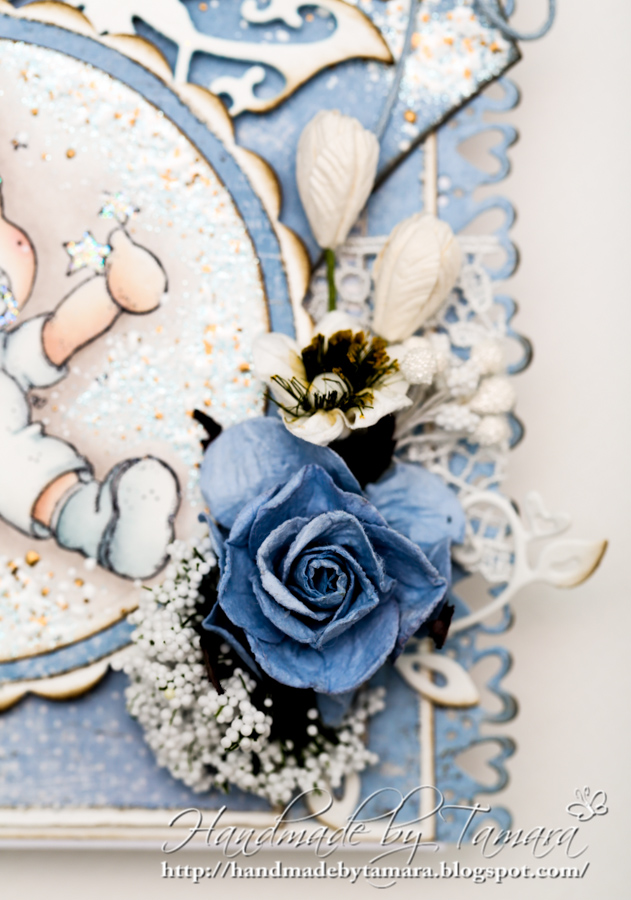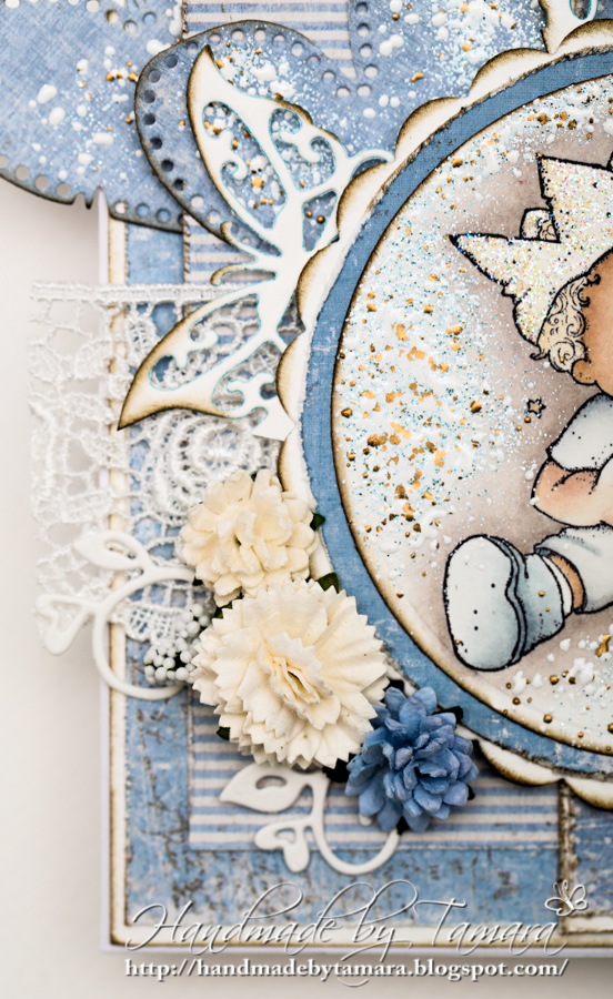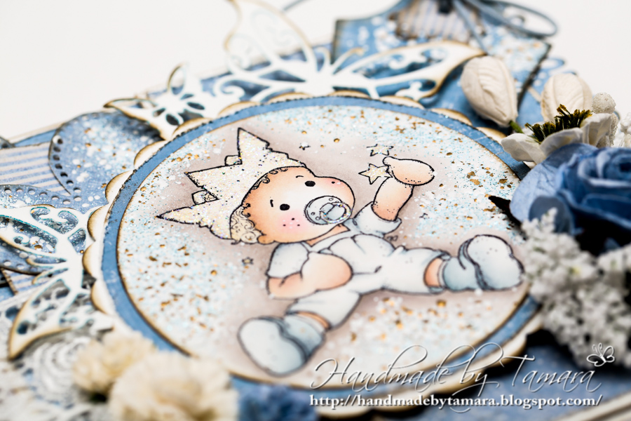 I made another baby boy card today. It’s so easy to make cards in blue or pink. Even though I colored this little prince so many times I still think he’s adorable. I used a lot of frantage around the image and also on the hearts and tag.