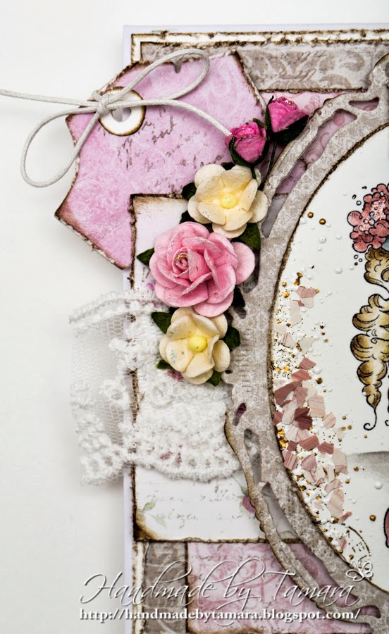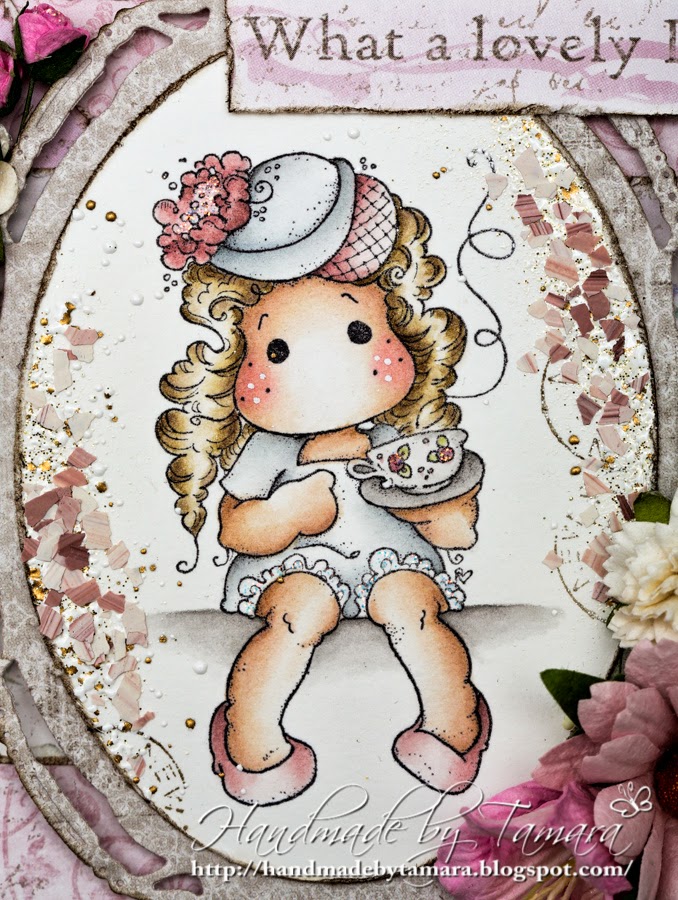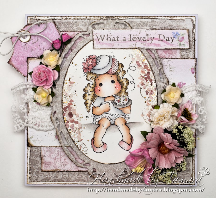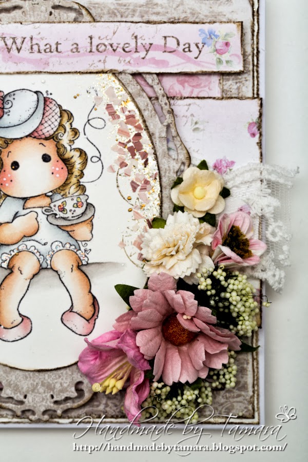 Today I have a card for you with one of my latest stamps – Afternoon Tea Tilda from Little London collection. Isn’t she a doll? I must buy her a bench to sit on. I used a lot of pink and brown on this one. I don’t use this color combination a lot, but I’m happy with the result.