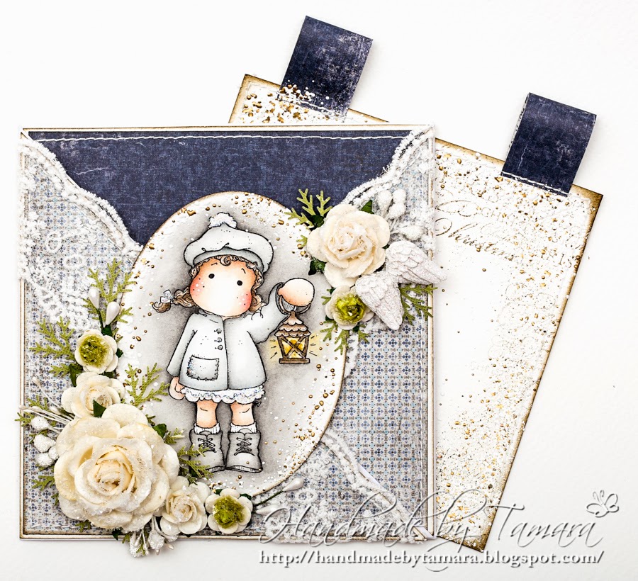 I made a criss cross card this time. I was inspired by the lovely cards my blog friend Teresa makes. They are amazing. Those of you who know her, know what I’m talking about. 🙂 I used one of the older Christmas Tildas called Midwinter Tilda. I used this stamp because I wanted to enter Magnolia Mania’s challenge called Lantern. There are no specific instructions about the lantern, whether it must be cut out of paper or it can be a stamped image?!? I hope my card will qualify.