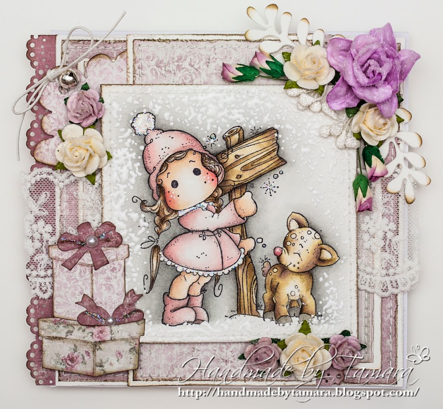 OMGOSHY GOSH! I LOVE this card to bits and pieces! Amazing pink and beige nuances and a truly astonishing little Tilda. She is cute as a boot! Your coloring is divine and your details are magical! The person getting this christmascard I hope will be feeling very honored!