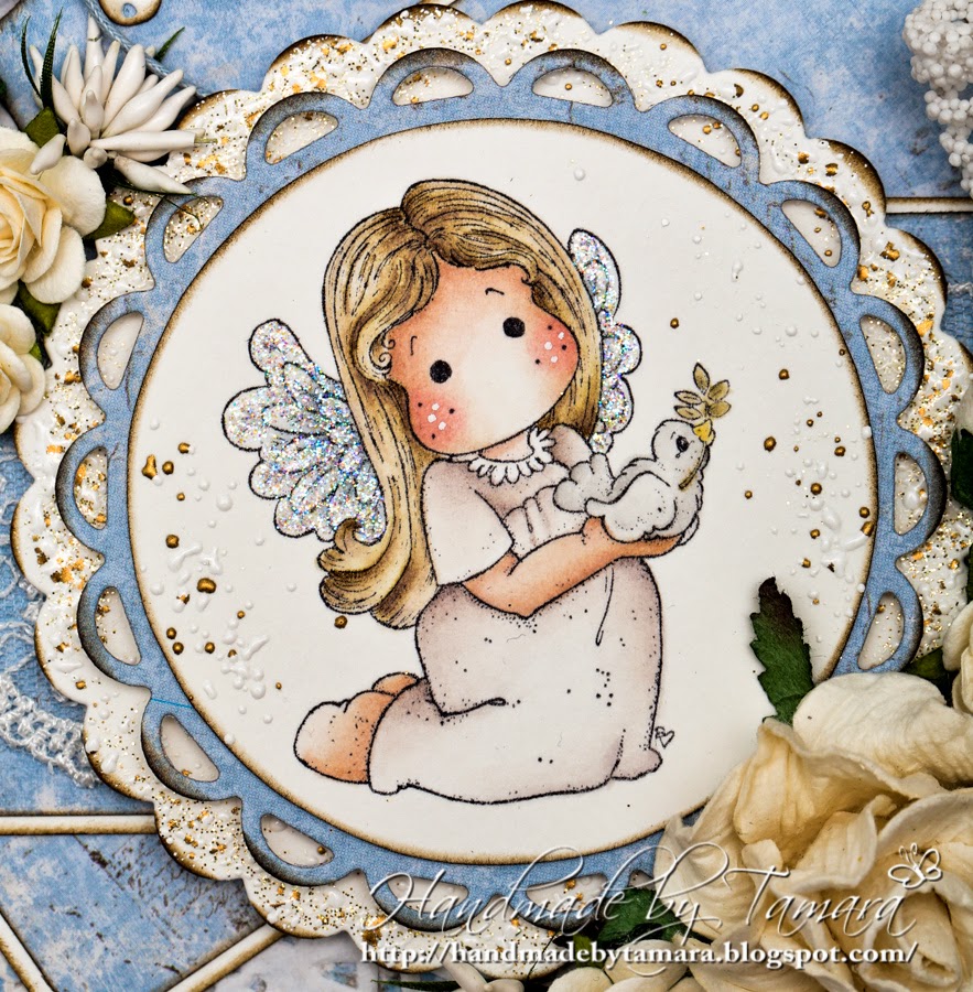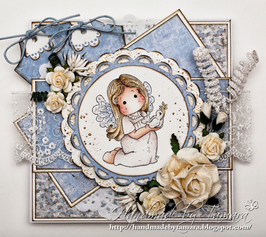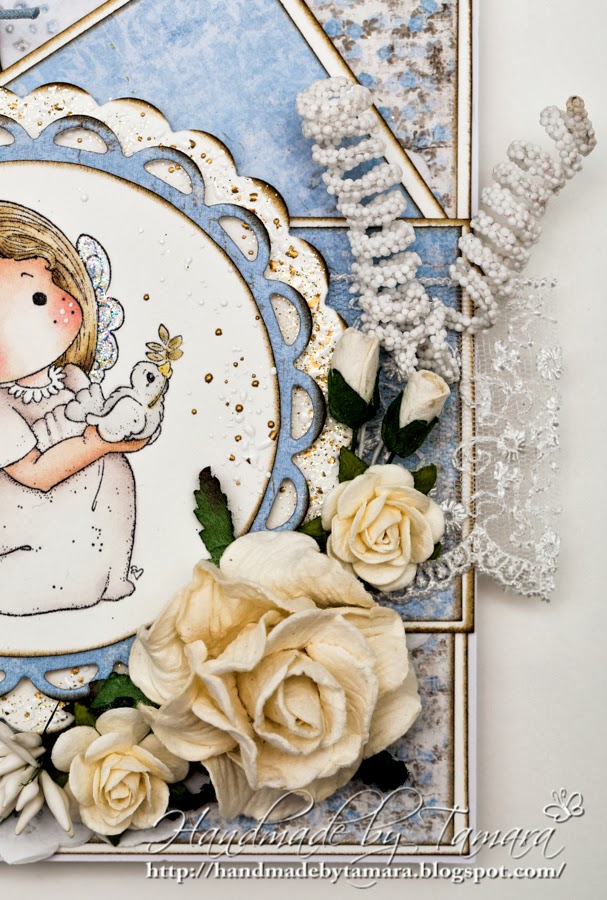 I never made a card for christening before, so I was a little lost at the beginning. I had a few stamps in mind and then decided to use Tilda with little dove from Nativity collection, 2012. Card is meant for two little boys (twins) so the main color is blue.