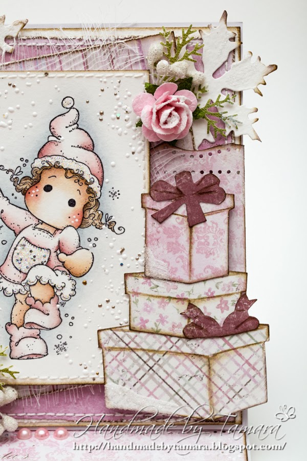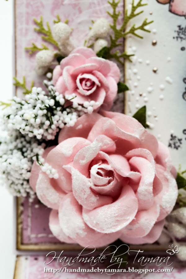 It’s been a while since I made an easel card. I really like them, they are something you don’t see or get every day. I chose my favourite color – pink.  I recently got these beautiful big pink flowers and they are just perfect for this card. Everything is covered with white crackle paint and clear rock candy glitter.