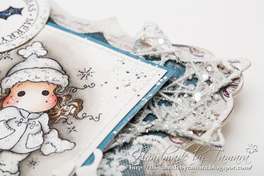 The shape of the card was cut out with my silhouette. I used Maja papers again and a lot of glitter. All the edges and die cuts are painted with TH crackle paint and then covered with glitter. The star in the corner was bought in a local store. I used one of the new Tildas – North pole Tilda from Winter Wonderland collection. I hear there’s a new one comming soon. Can’t wait … 😉