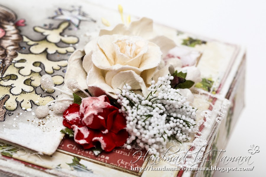 I once again used this adorable Merry Christmas Tilda from Winter Wonderland collection. I love her and her cute striped pants! I masked her with Peaceful Christmas tree from the same collection. I made a gift/storage box for photos or basically anything else. 🙂 I got the design from Silhouette online store and then adjusted it to the right size.