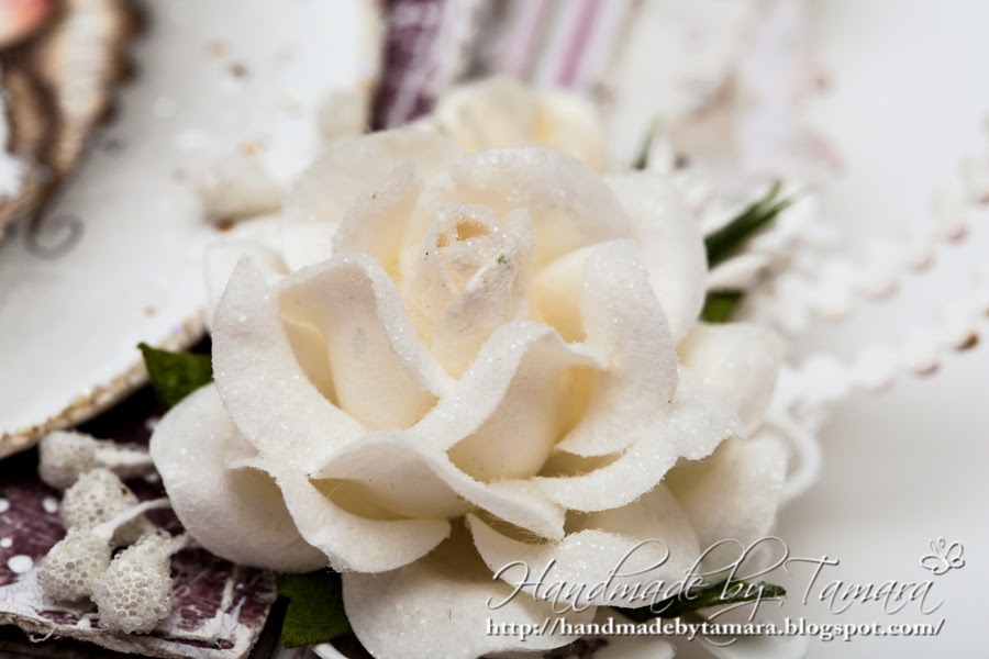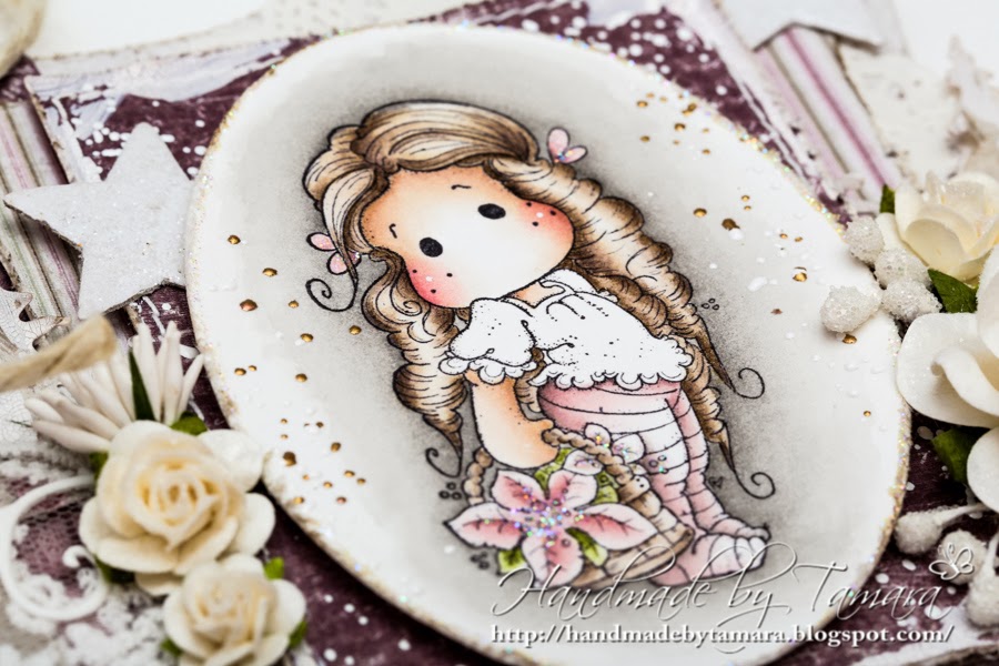 Gorgeous card, Tamara. Love this colour scheme. Tilda is adorable and you've coloured her beautifully with your distress inks–I have to give those inks a try. Love the shape of your card. Gorgeously embellished.