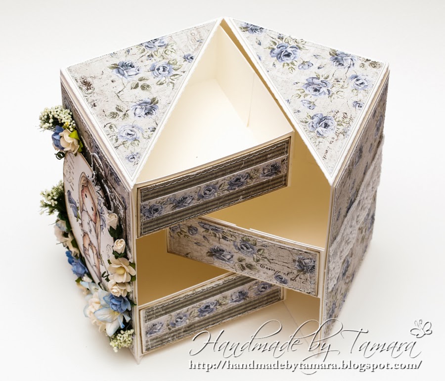 I made a Birthday gift box with the beautiful Maja design papers and used one of the Tildas I bought quite a while ago, but didn’t had the chance to use it. I was thinking how to cover that cross, but it was easier to leave it on. lol
