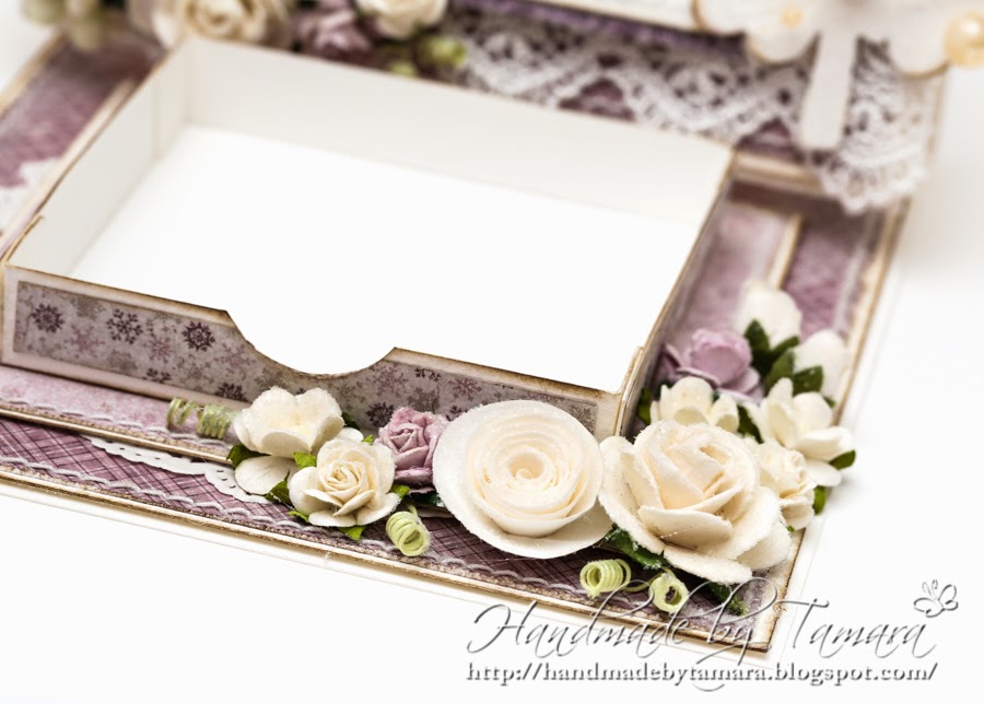 I made a sticky notes holder card. I saw a few pictures on the internet and wanted to try it. It’s very easy, you can make it as big as you wish. I made it 13,5 x 13,5 cm. It’s easy but it will take you a few hours to complete. The base of the holder is cut out of 300 g paper and then everything is glued and sewn together. Flowers are covered with clear rock candy glitter so they all sparkle!