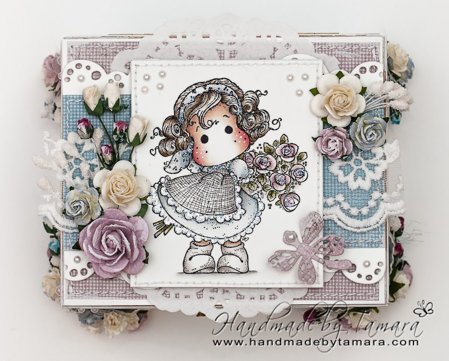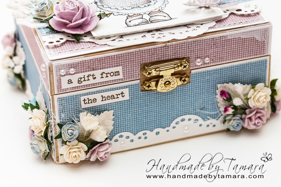 I made this box a few weeks ago, but just didn’t have the time to post it. I bought the wooden box last year. I covered it with Maja design papers, flowers and pearls. I think it would be a lovely present for someone who likes no nose girls (I know a lot of people that have trouble with them). 😉