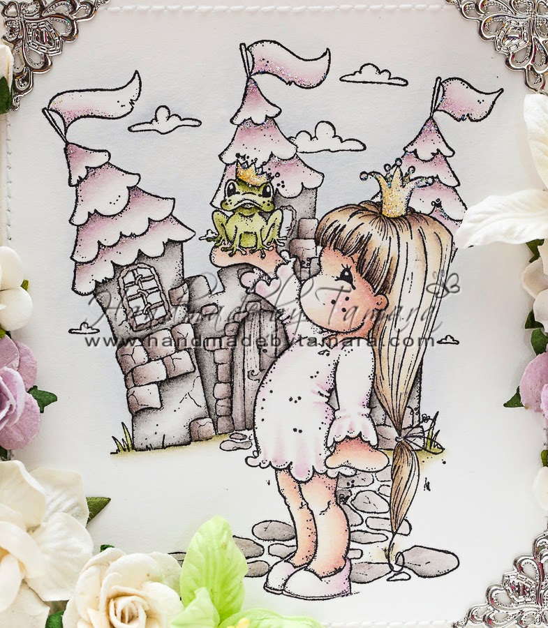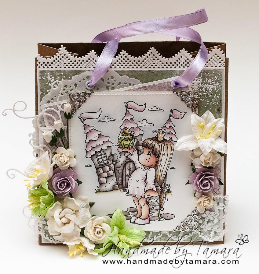 I made a gift bag on which I masked two Magnolia stamps: Tilda’s castle and Tilda with prince froggy. I rarely use green colour, but I had to colour prince froggy in green (I think it would have been a little strange if princes would be kissing orange or blue frog, right?).