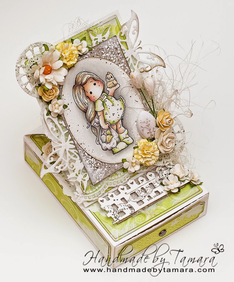 I made an easel card with drawer. I used a lot of different stamps and dies for this project and I hope you’ll like it. 😉