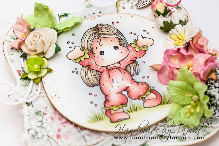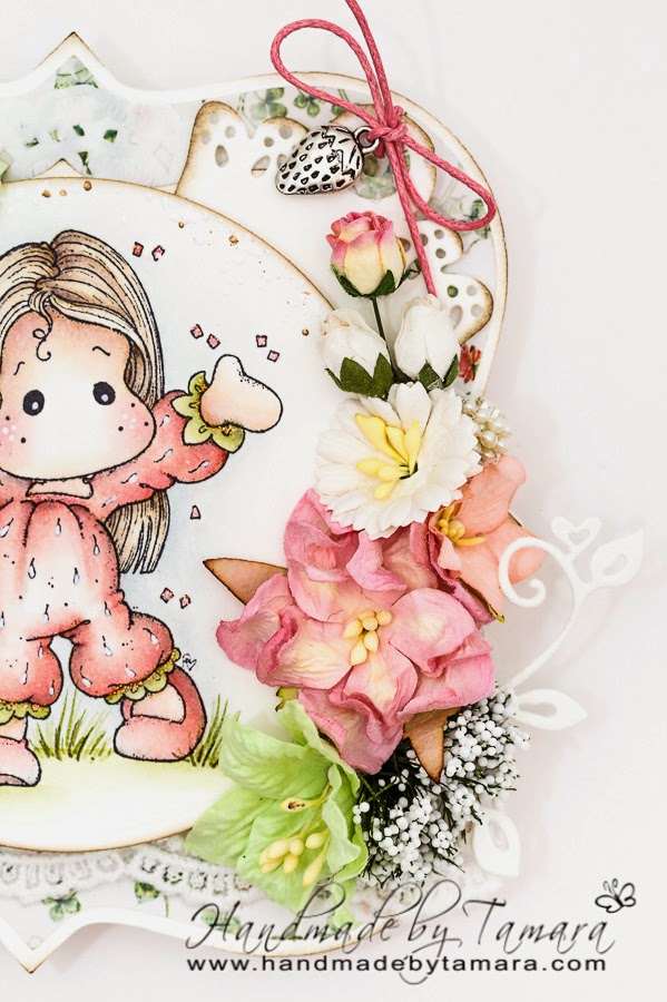 Gorgeous card, Tamara. Wonderful shape. Love this adorable Tilda–beautifully coloured. I haven't coloured mine and didn't realize until now that Tilda's suit is like a strawberry and that's why they call her Strawberry Tilda…duh. Love the design and the gorgeous floral arrangements.