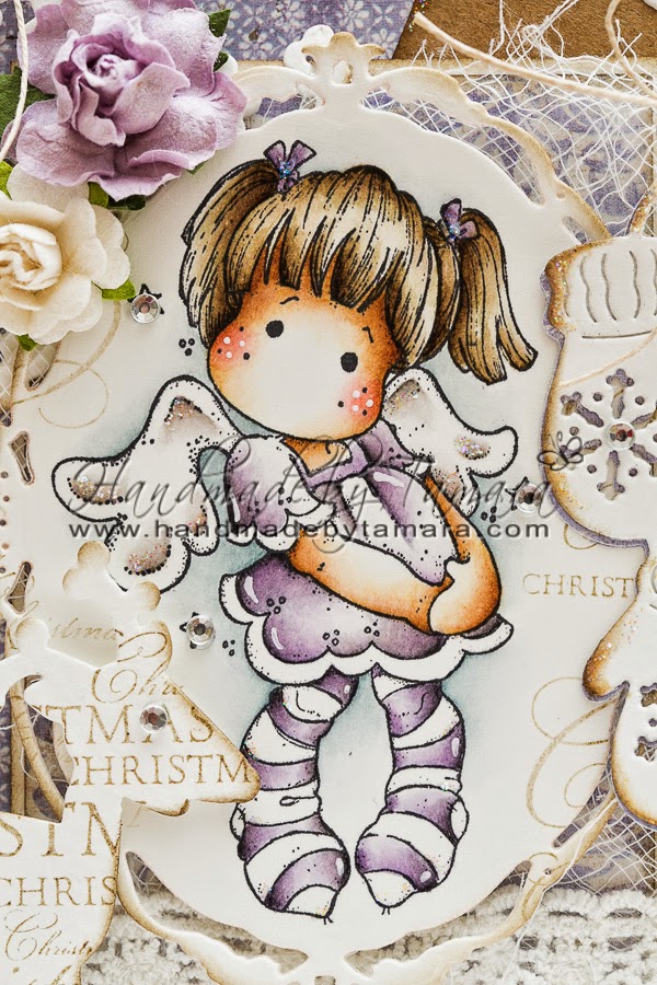Ever since I had to do a tag for I am roses challenge blog a few months back, I can’t stop making them. Today I’m showing you my purple Christmas tag with Dancing with stars Tilda. This cute little angel is perfect for Christmas and I think I should be using this stamp more often. 🙂