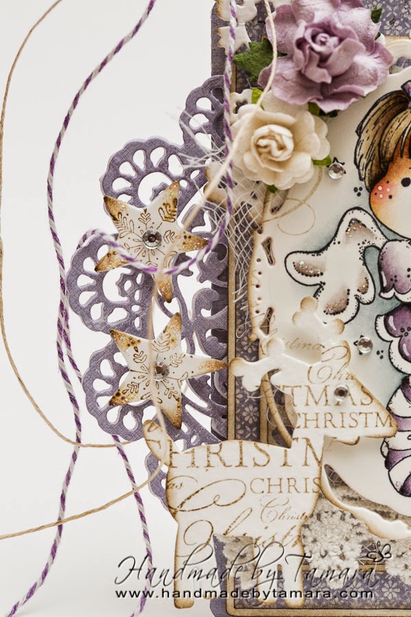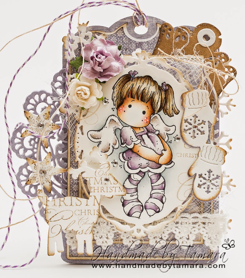 Ever since I had to do a tag for I am roses challenge blog a few months back, I can’t stop making them. Today I’m showing you my purple Christmas tag with Dancing with stars Tilda. This cute little angel is perfect for Christmas and I think I should be using this stamp more often. 🙂