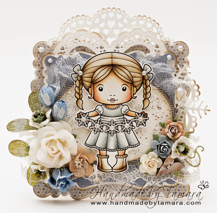 This week our inspiration project are all about Snowflakes!!! I chose this pretty Marci with snowflake garland and coloured her with distress markers and inks. Papers are Maja and flowers as usual, from I am roses. 🙂