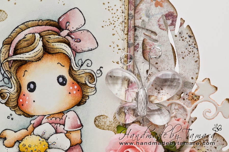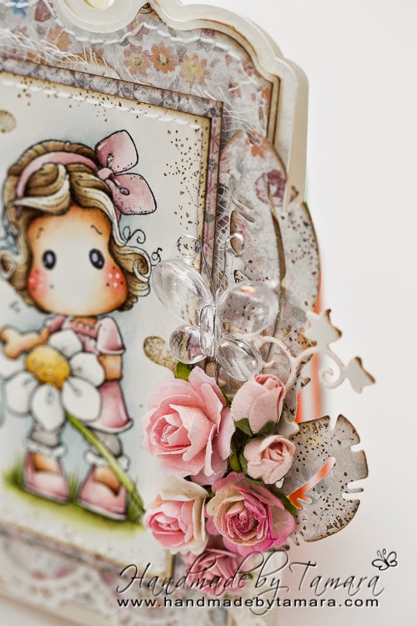 I used one of the Stampelglede stamps to make all the litle spots and dots arround the sweet Tilda. I used Loves me loves me not Tilda from the latest Lovely duo collection and made a tag with her.