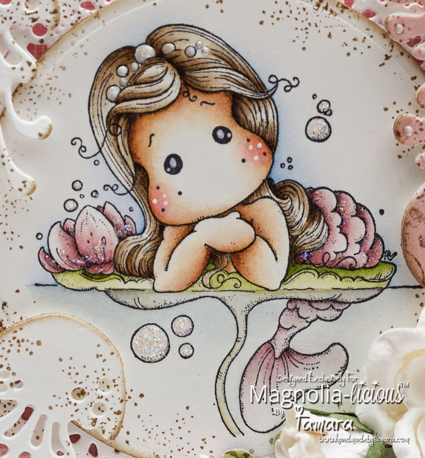 Tilda was coloured with Distress markers and inks. I added Stickles glue (stardust) to her tail and liquid pearls to her hair.