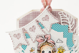 I coloure her in with Distress markers and ink pads. I cut out the image with Spellbinders die called Labels eighteen.