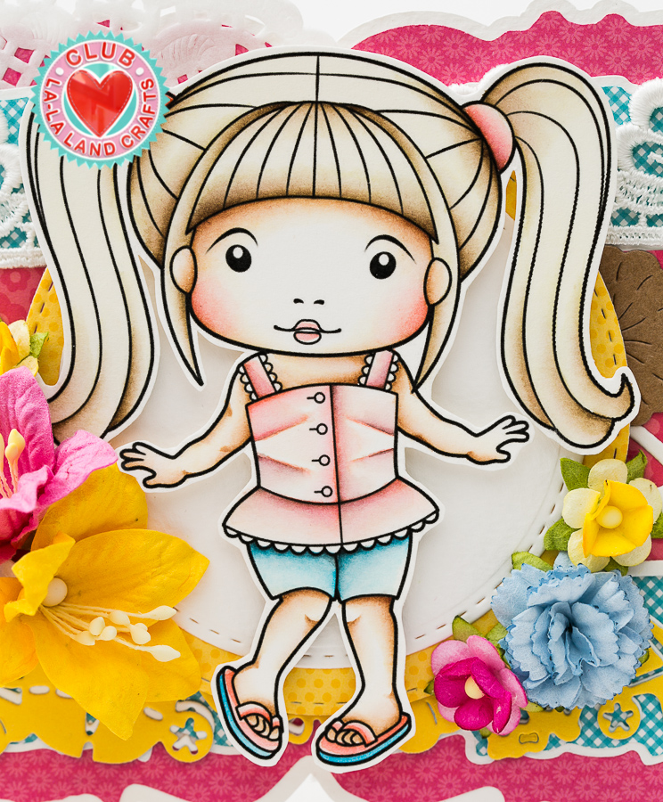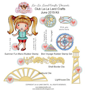 Today I’m sharing with you my two projects made with la-la land June club kit. To be honest with you this is my favourite Marci of all time. Her pony tails are so cute and she is so much fun to colour in. Here’s a picture of what this month’s kit includes.