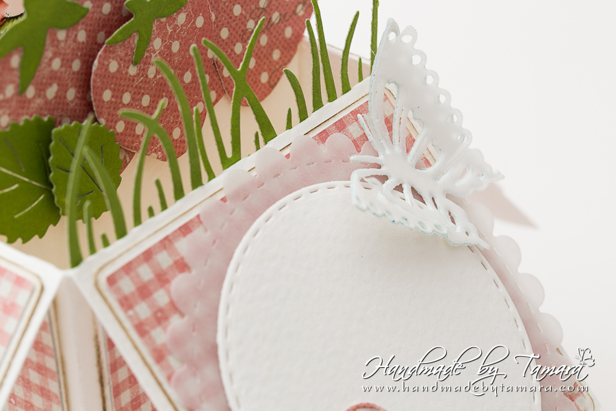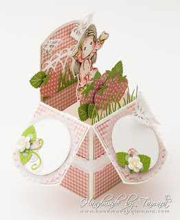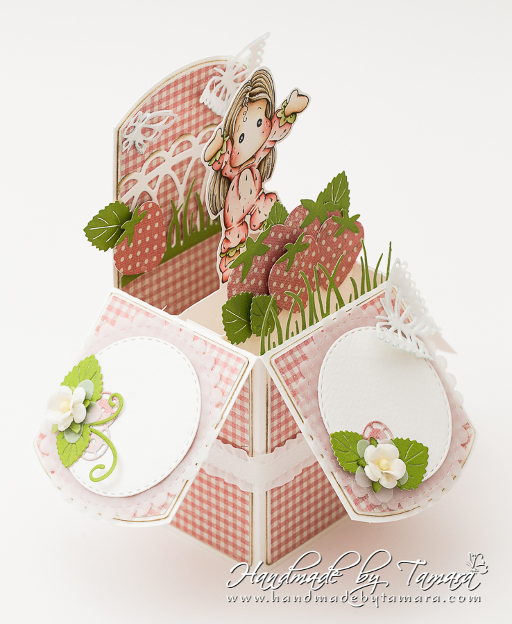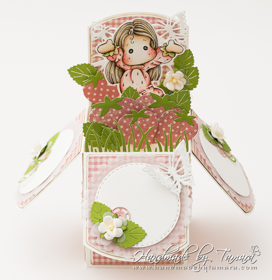 I decided to make a box card with the strawberry theme. I haven’t done one in a while, so here it is … full of sweet strawberries and with lovely Summer Strawberry Tilda.