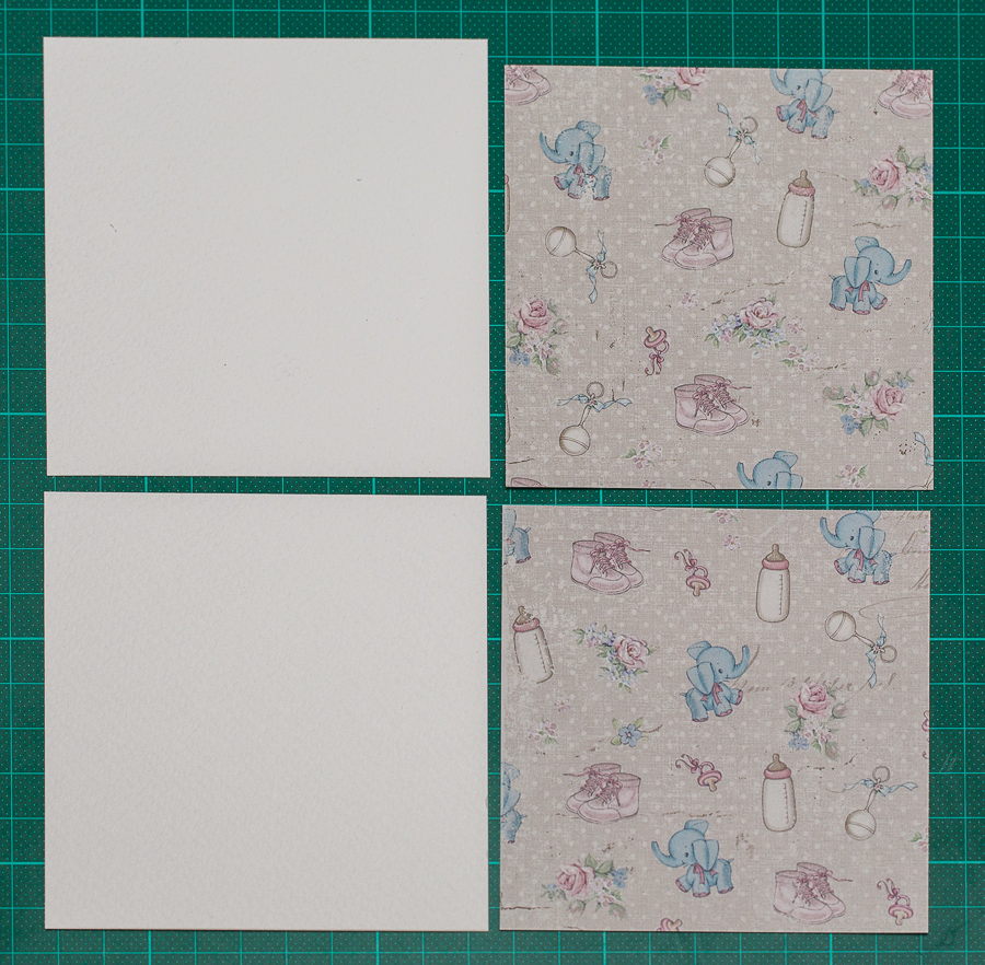 Take your white cardstock and cut out two 9,7×9,7 cm squares. Then you take your design paper and cut out two 9,4×9,4 cm squares. Use any kind of glue and glue design paper on to white cardstock.