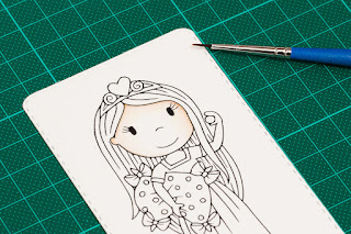 For colouring hair I need two distress markers: antique linen and walnut stain. First I use antique linen and colour the whole hair with it. I use very wet brush, so the colour is very bright. I leave it dry out for a few minutes and use that time to colour her pillow. First I draw lines where the folds are and then start colouring the inside of each fold.