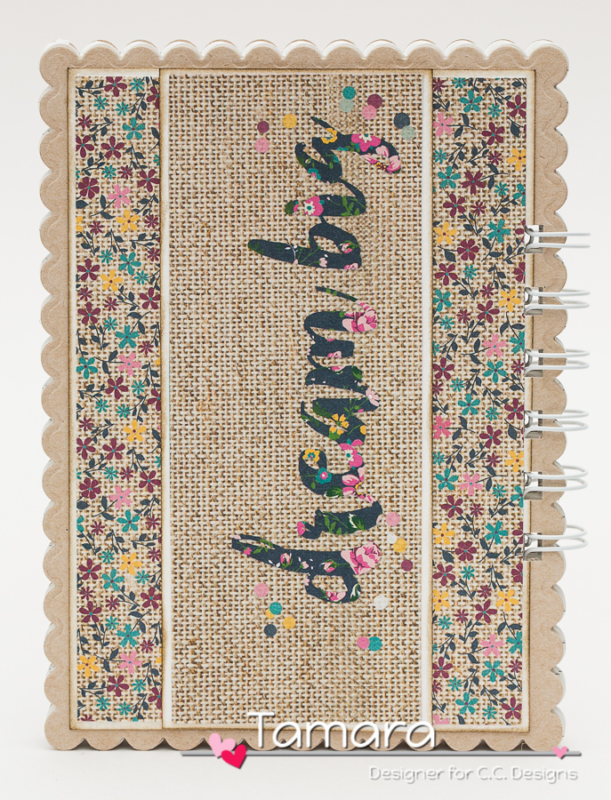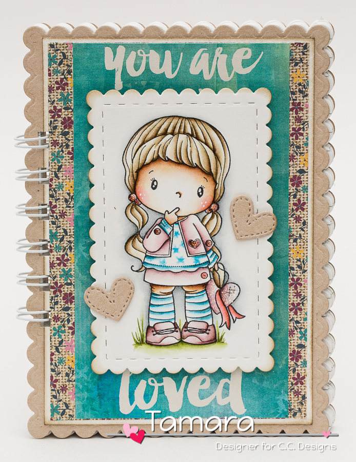 Soooo …. I used Birgitta with heart on my notebook and coloured her with Distress markers and ink pads. I cut her out with Make a card #9 Autumn stitched scalloped rectangle and added a few stitched hearts from the same die set. The shape of the notebook and all the sheets inside were cut with Make a card #1 die set.