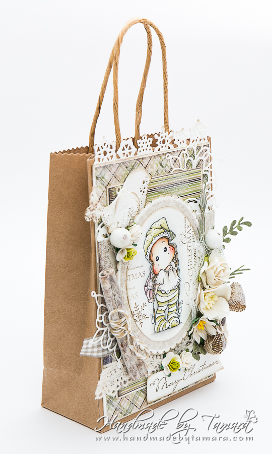 Tilda was coloured with Distress markers and ink pads. I stamped the background with Merry christmas sentiments and snowflake from the latest stamp club. Sentiment “Merry Christmas” at the bottom is also from the latest stamp club. Love the font they used. So pretty!