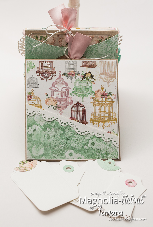 Here’s the inside. It was not easy to photograph at all! There are two pockets inside with a pull out tags where can you place a photograph or simply write a sentiment. There is also one pocket with tags, for names, sentiments ….