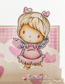 For this box card I used Lil Love Bug and coloured her with distress markers and distress ink pads.