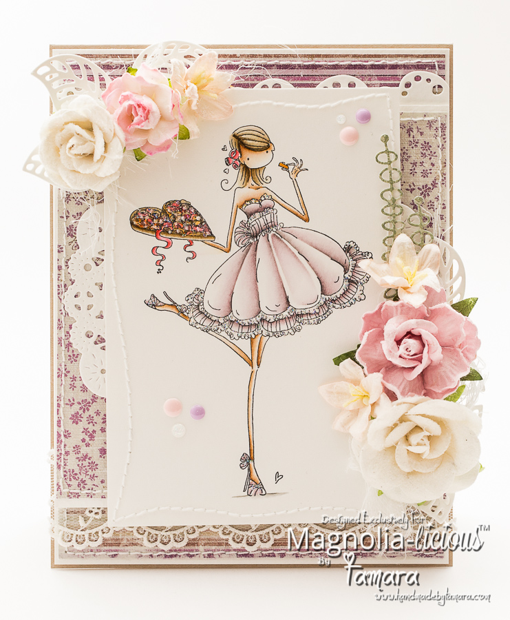 For my dt project I made a Birthday card using  Uptown girl CATHERINE nibbling chocolate from Stamping bella