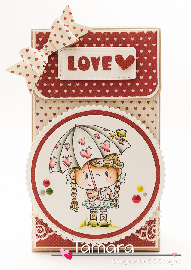 Today I have a Valentine’s day gift bag for you! I made this bag myself. If you want to know how just find it a few posts back. I used the super adorable Rain from Pollycraft and coloured her with Distress markers and ink pads.