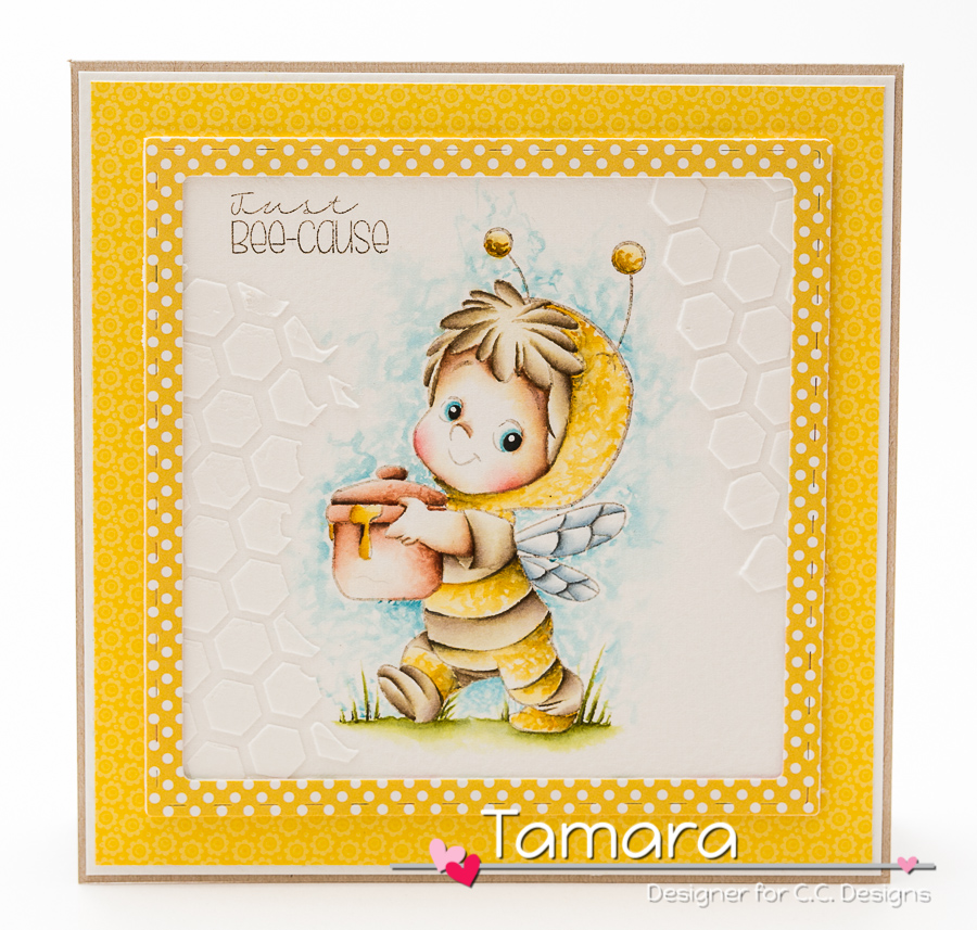 For this preview I made a card using Bee Henry from Roberto’s Rascals. I coloured him in no-lines technique (fade lines in my case, lol) using distress markers and distress ink pads.