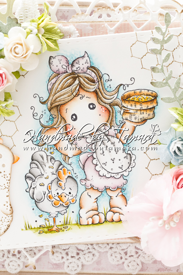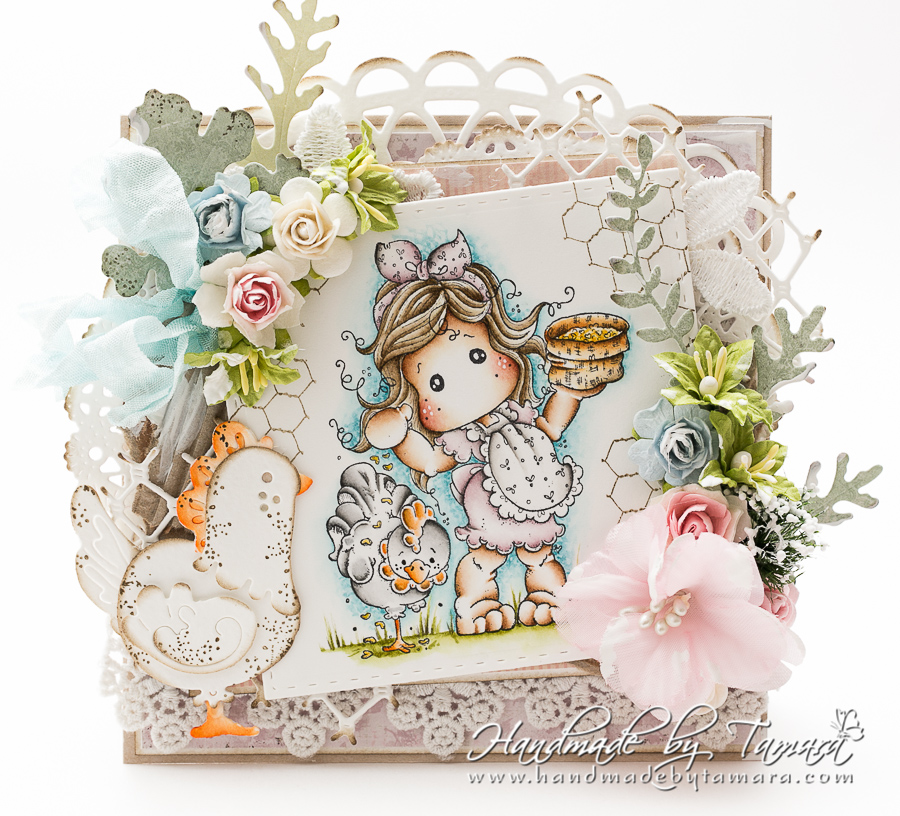 Today I’m showing you one of the Easter cards I made this year. I absolutely love this one. I used Tilda with Cock-a Doodle-Doo the Rooster from Animal of the year collection, 2014 and lost of pretty dies and flowers.