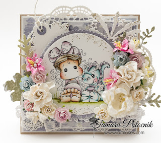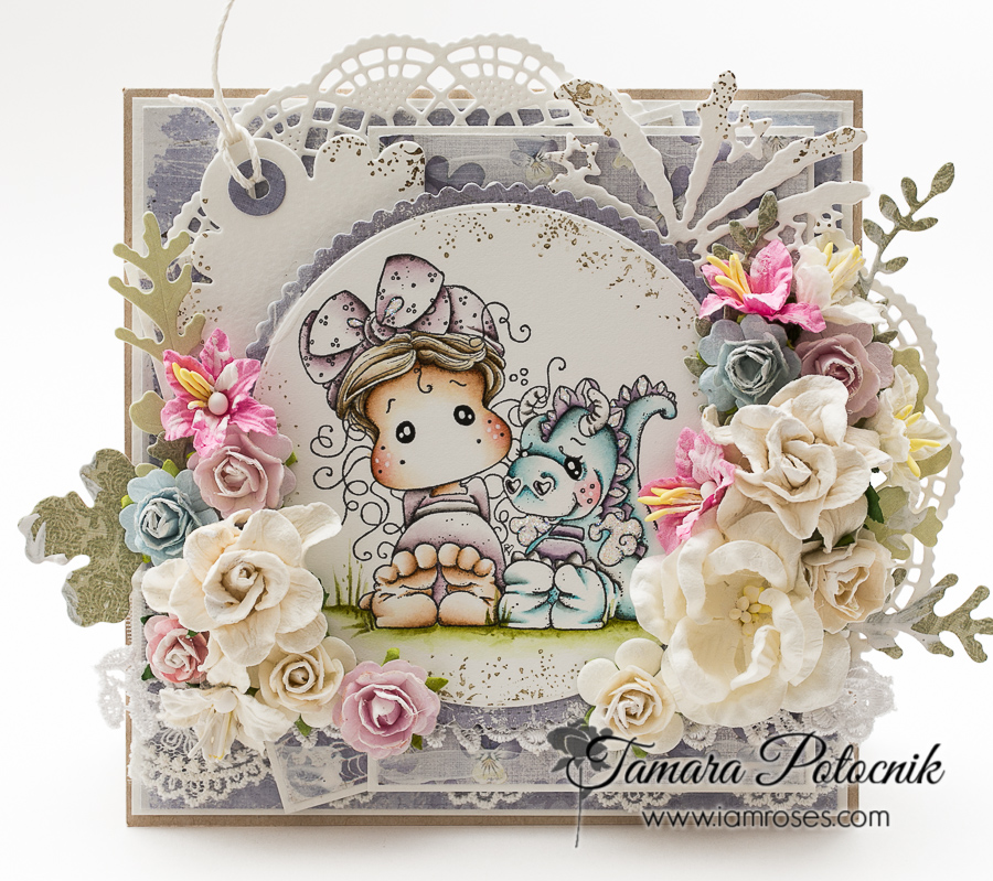 Today I’m sharing with you a card made for I am roses design team. On my card I used Tilda with Dexter the dragon from Animal of the year collection, 2014. I coloured her using distress markers and distress ink pads.