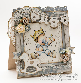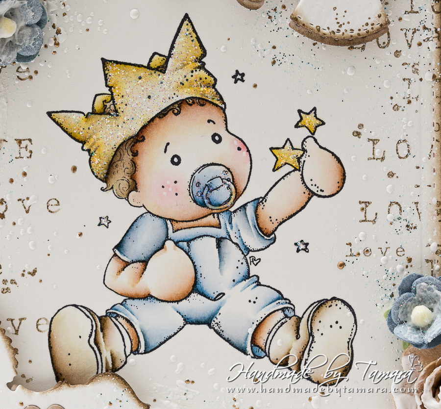 Today I’m sharing with you a Vintage baby boy card I made. I loveee colouring this little cuttie. He’s name is Baby Edwin and he was released in 2012 as part of Prince and Princesses collection. I stamped Love background behind the image and used some shabby white frantage.