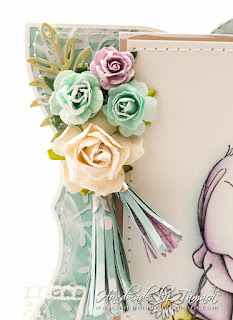 I had to add some flowers. I put Vintage Flourishes Leaf die cut behind them, because I really like adding something green on my cards.