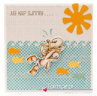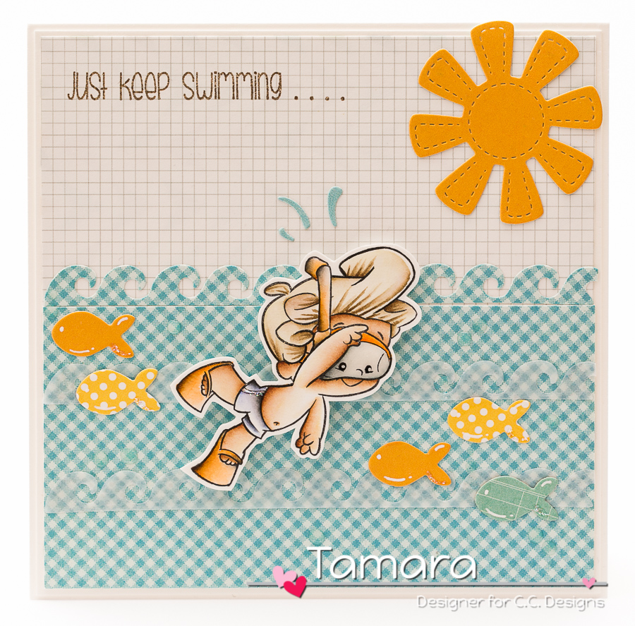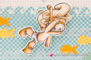I coloured this little sea explorer with Distress markers and Ink pads. I added glossy accent to his mask. I created the see with the help of Make a card #16 Summer dies. Fish are also part of that die set.