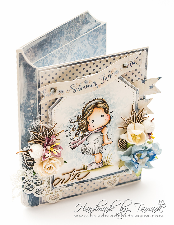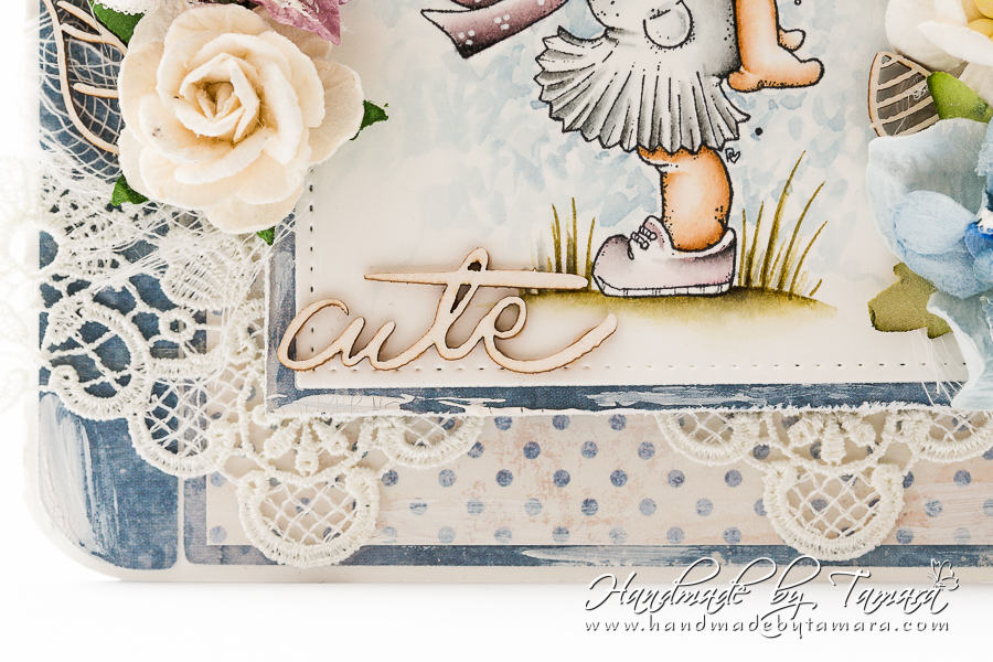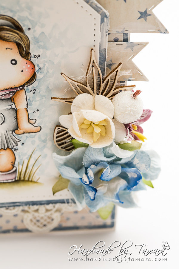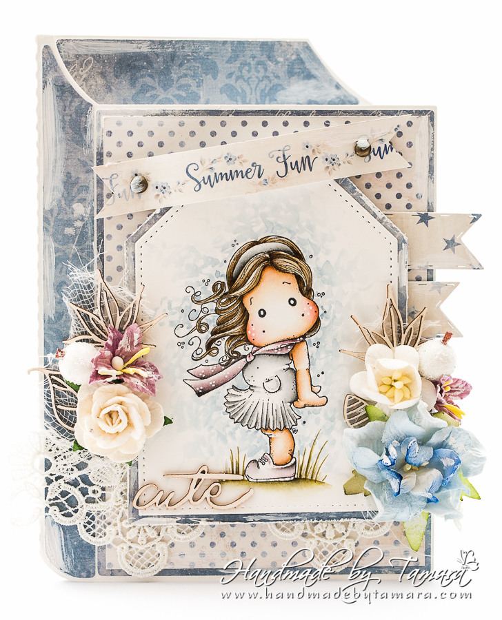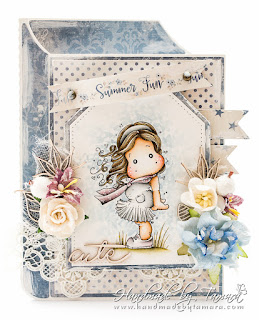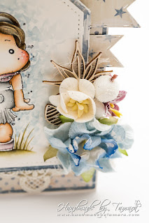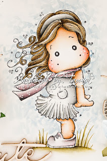For this card I coloured up a Magnolia image called Tilda in the wind (Seaside coll., 2016). I used Distress markers and ink pads for colouring.