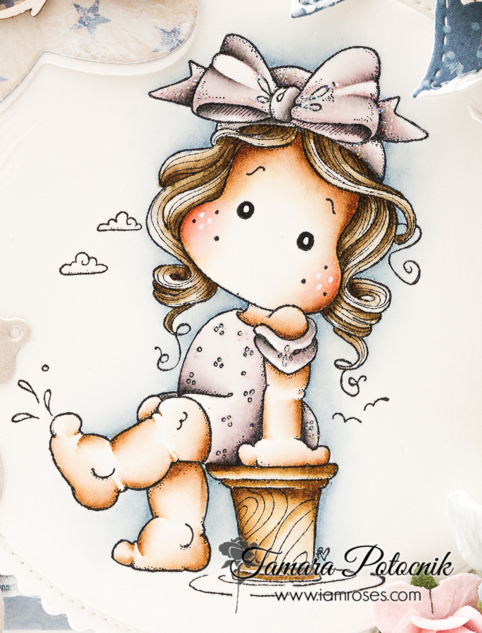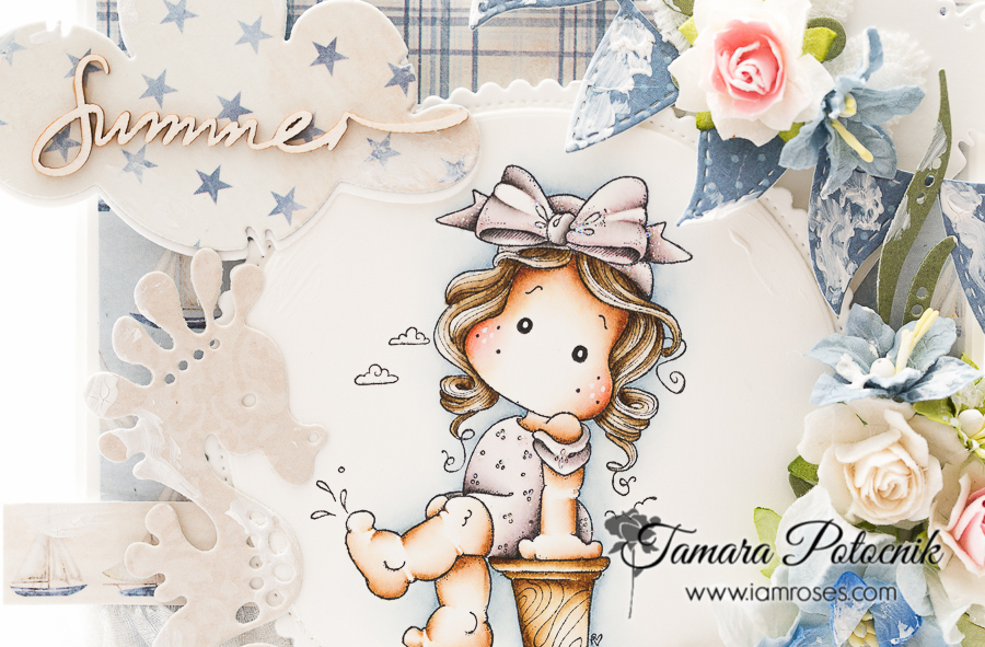 For September challenge dt project I made a Summer card, probably the last one for this year. I used Sunbathe Tilda from Magnolia’s SeaSide collection. She was coloured with distress inks.
