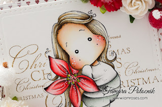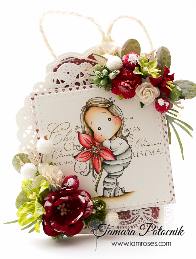 I coloured one of the latest Magnolia stamps called Poinsettia Tilda (Aspen Holidays coll, 2016). She’s just the cutest thing ever!!! I stamped a Merry Christmas stamp on the back.