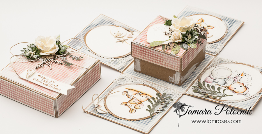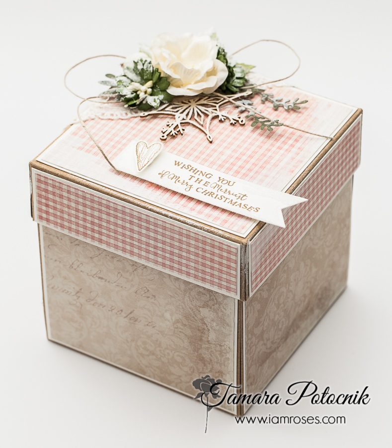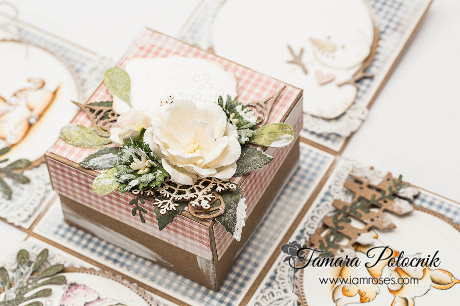 Iside the box I put another smaller box, for a little prezzie and decorated it with pretty Maja Design papers and I am roses flowers. I used white and green flowers on this box. It’s a bit unusual colour combo for me, but it works really great on this project.