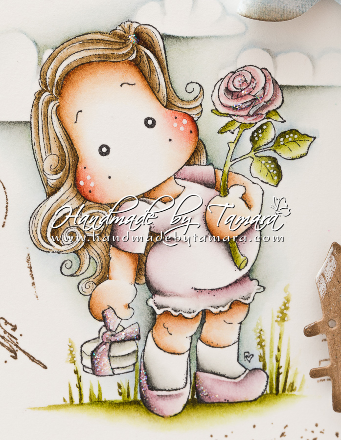 I coloured my image using distress markers and ink pads. I added grass and clouds in the background. Arround the image I stamped a few background stamps from Vintage box kits.