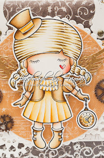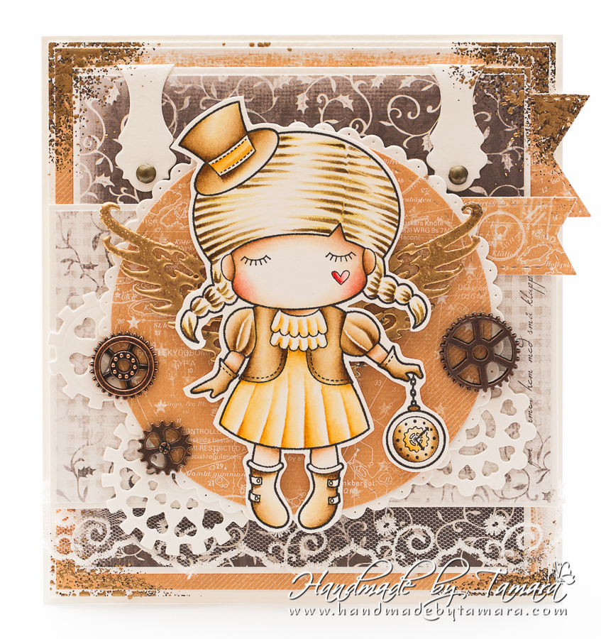 This week’s theme at la-la land crafts is Shimmer and Shine. I made a Steampunk inspired card. I coloured Paper Doll Marci – Steampunk with Distress inks and added lots of gold frantage to the card.